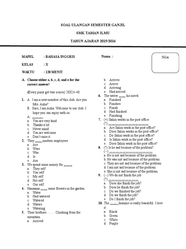 Soal ini sudah kakak susun sebanyak 60 soal dimana sudah terdapat kunci jawabannya. Soal essay uts bahasa inggris kelas 7 semester 2 sumber. Pembahasan soal sedang dalam proses pengerjaan. Soal latihan bahasa inggris kelas xi semester 2 k1. Soal pat bahasa inggris kelas xi pdf (download).